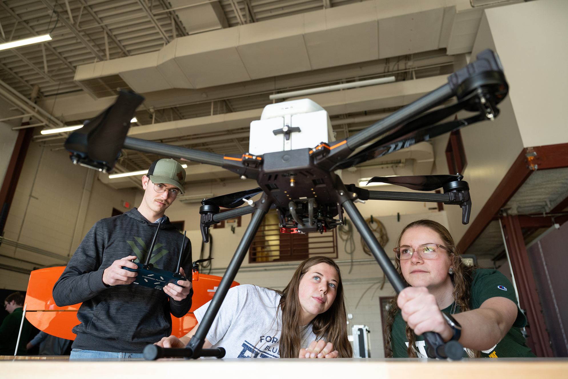 three students working with a drone