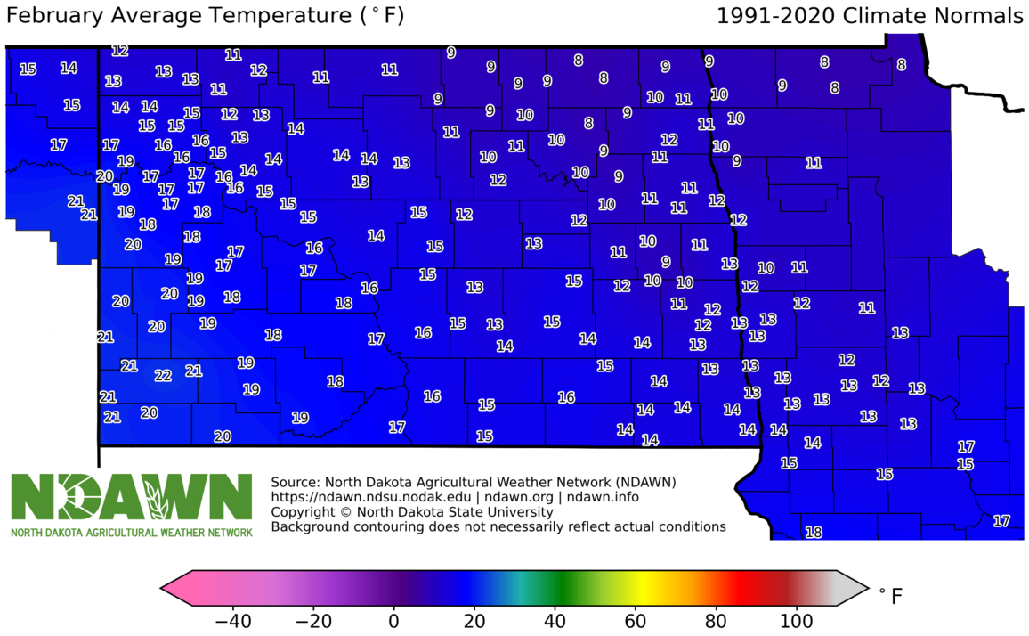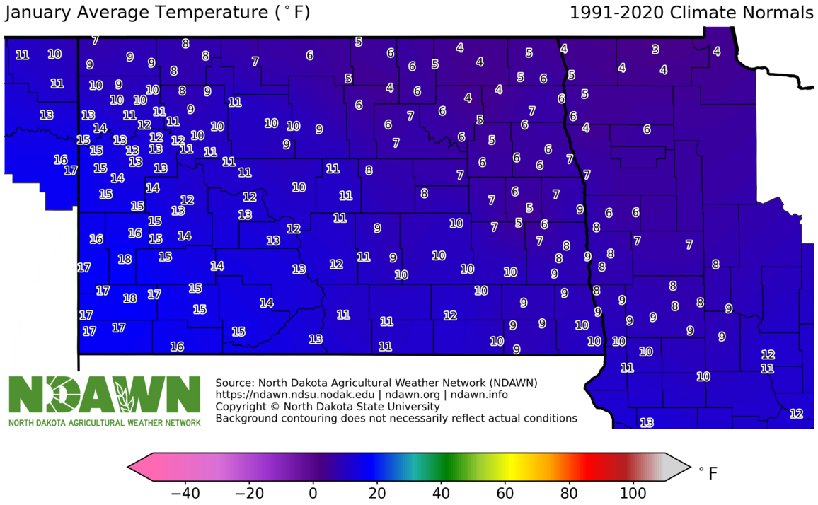 January Average Temperature (°F) 1991-2020. Source: North Dakota Agricultural Weather Network (NDAWN). © Copyright North Dakota State University. Background contouring does not necessarily reflect actual conditions.