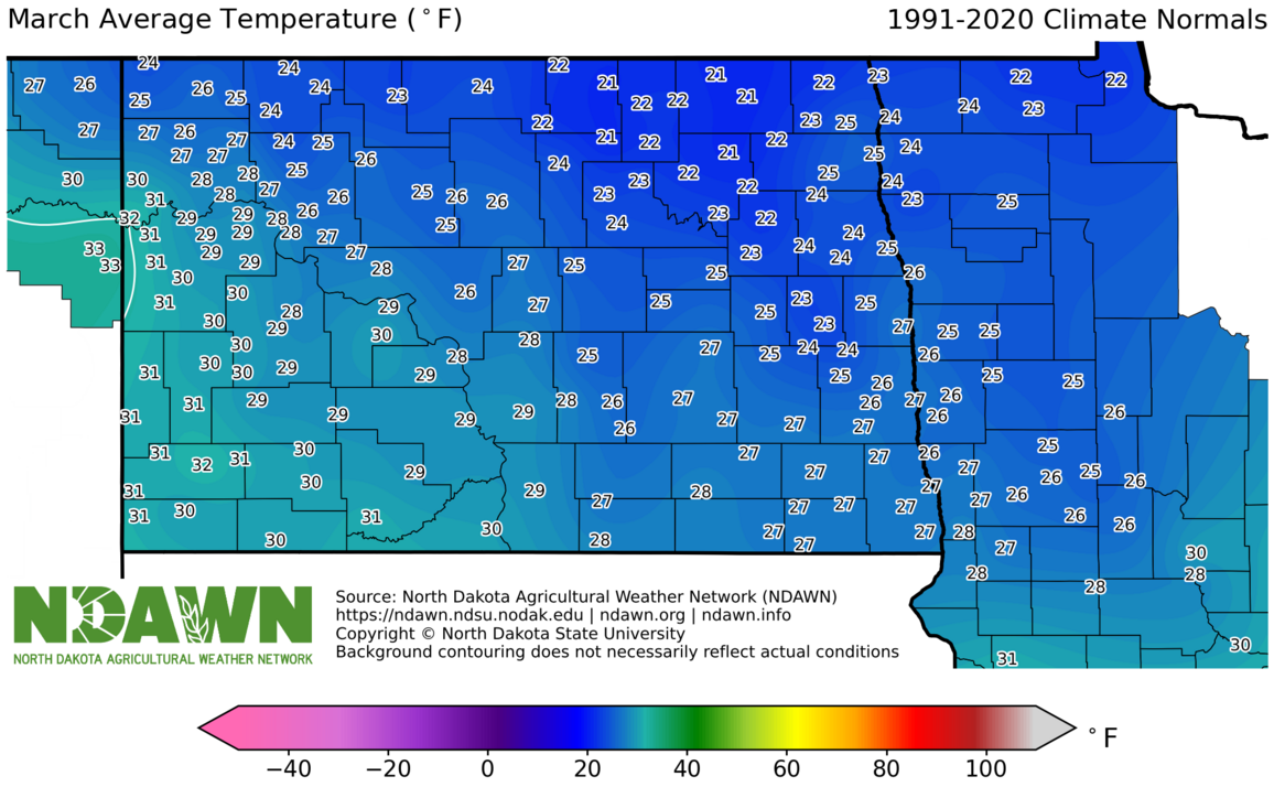 March Average Temperature (°F) 1991-2020. Source: North Dakota Agricultural Weather Network (NDAWN). © Copyright North Dakota State University. Background contouring does not necessarily reflect actual conditions.