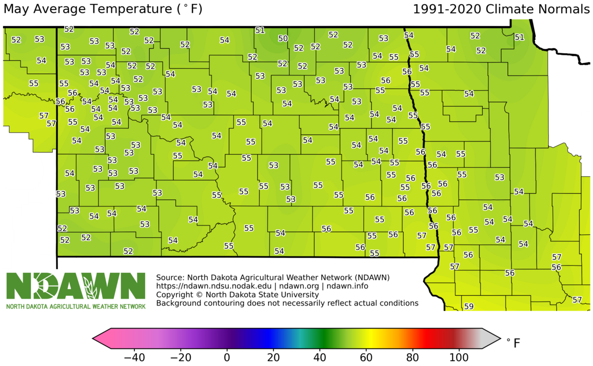 May Average Temperature (°F) 1991-2020. Source: North Dakota Agricultural Weather Network (NDAWN). © Copyright North Dakota State University. Background contouring does not necessarily reflect actual conditions.