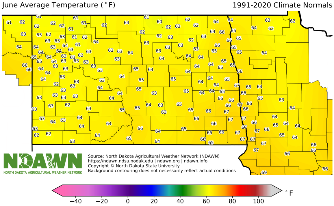 June Average Temperature (°F) 1991-2020. Source: North Dakota Agricultural Weather Network (NDAWN). © Copyright North Dakota State University. Background contouring does not necessarily reflect actual conditions.