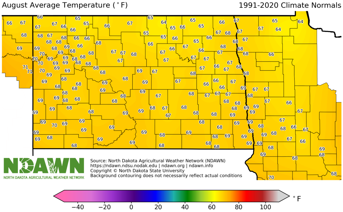 August Average Temperature (°F) 1991-2020. Source: North Dakota Agricultural Weather Network (NDAWN). © Copyright North Dakota State University. Background contouring does not necessarily reflect actual conditions.