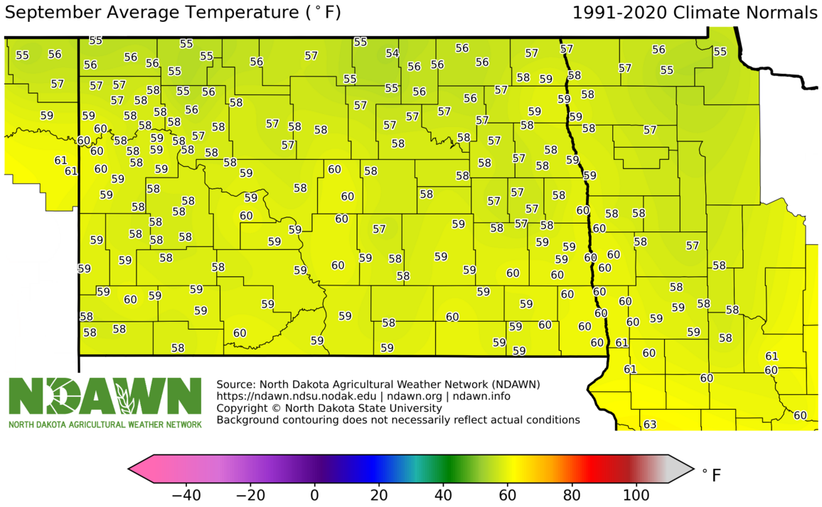 September Average Temperature (°F) 1991-2020. Source: North Dakota Agricultural Weather Network (NDAWN). © Copyright North Dakota State University. Background contouring does not necessarily reflect actual conditions.
