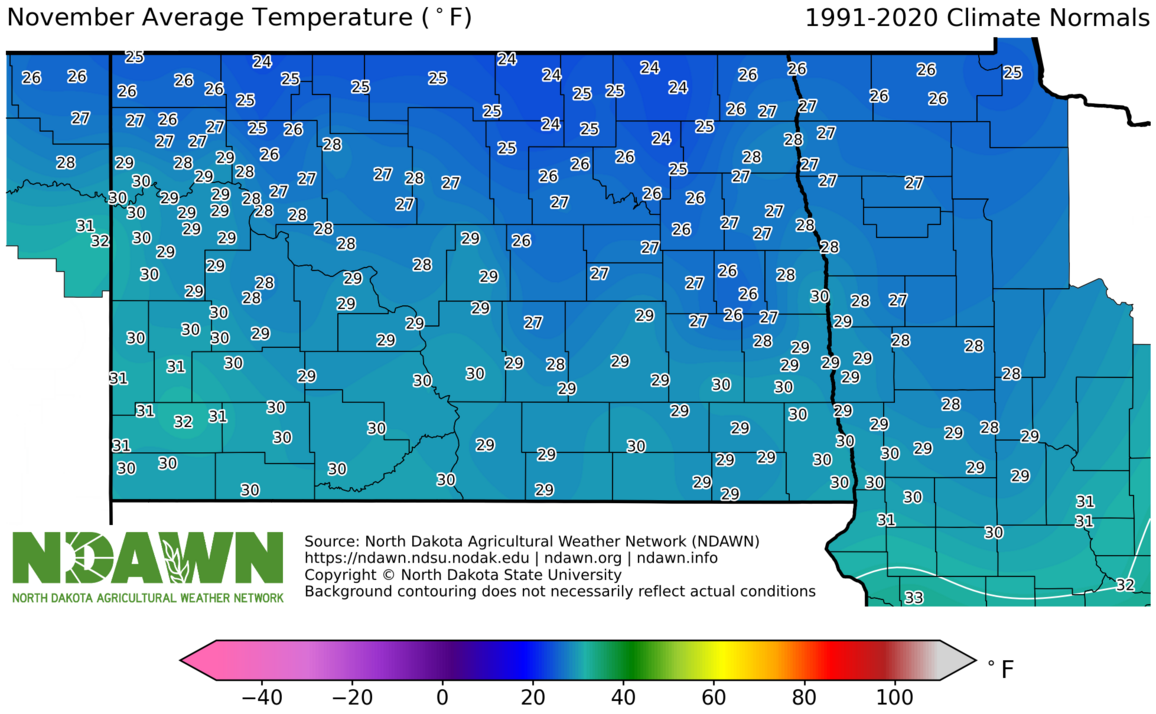 November Average Temperature (°F) 1991-2020. Source: North Dakota Agricultural Weather Network (NDAWN). © Copyright North Dakota State University. Background contouring does not necessarily reflect actual conditions.