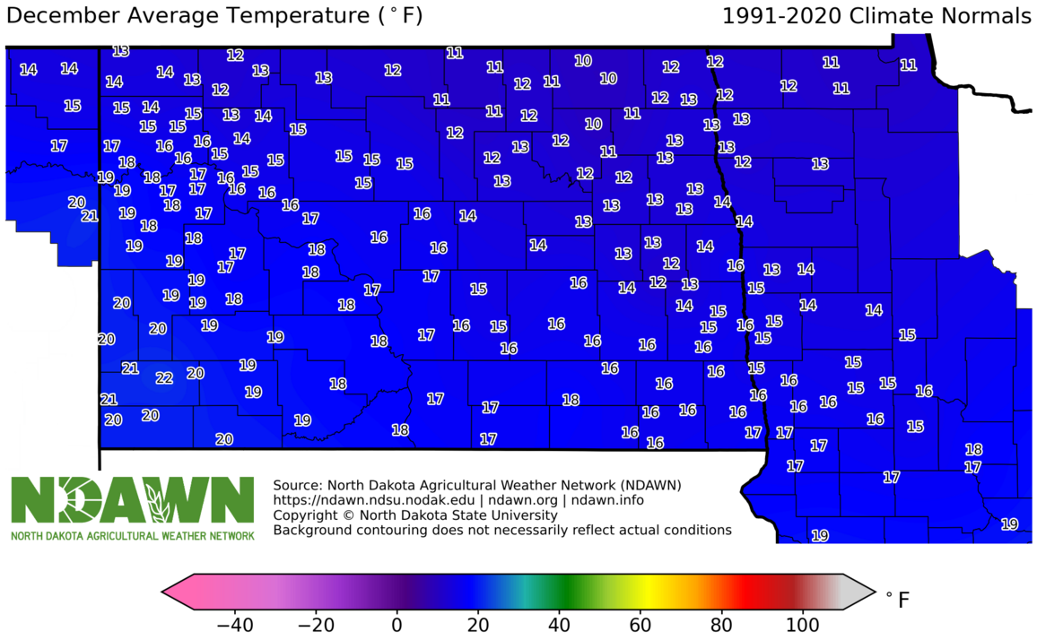 December Average Temperature (°F) 1991-2020. Source: North Dakota Agricultural Weather Network (NDAWN). © Copyright North Dakota State University. Background contouring does not necessarily reflect actual conditions.