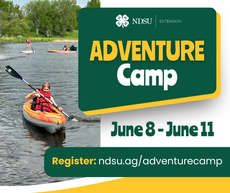 Come experience a variety of 4-H activities! Adventure camp focuses on different activities each day and encourages friendship, leadership and an appreciation for the outdoors. Topics will include making jerky, kayaking, canoeing, swimming, archery and STEM activities.