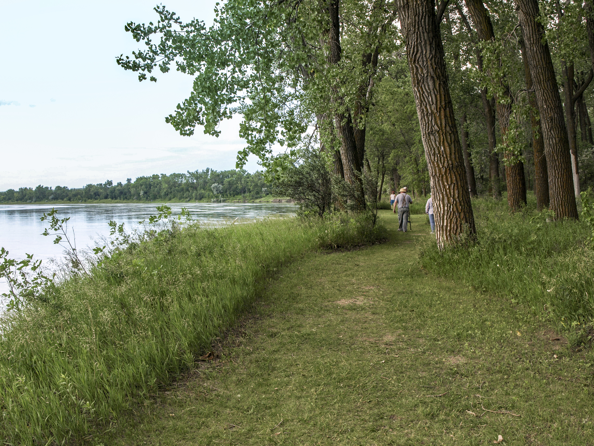 two people walking on a path next to a river