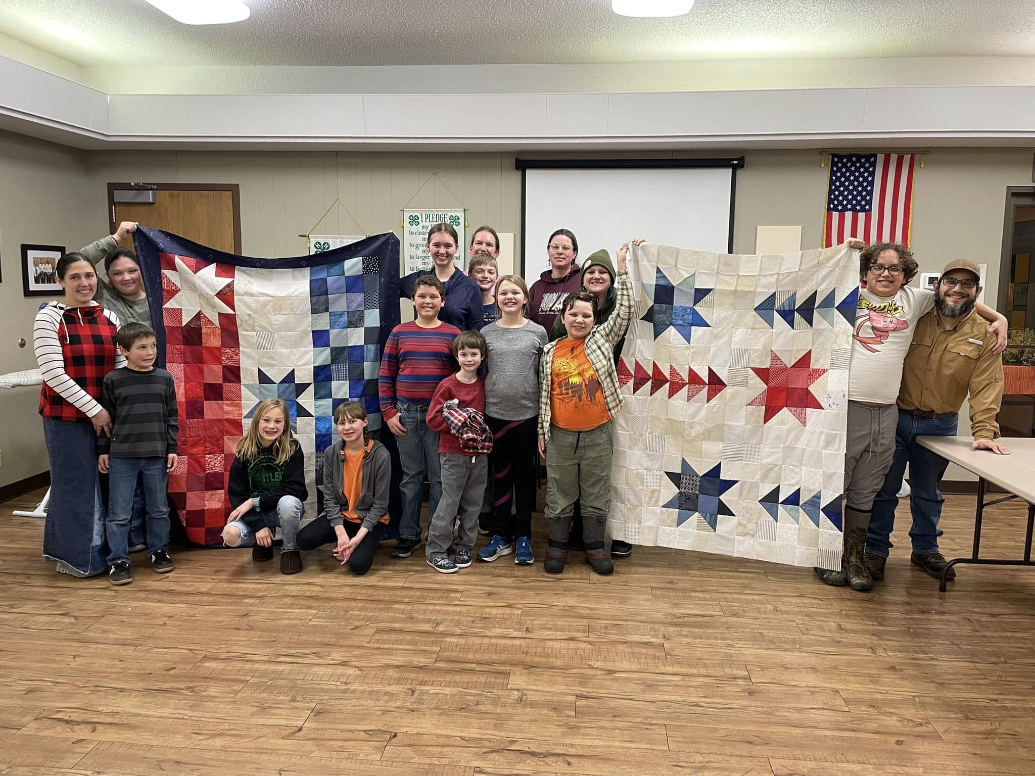 kids and volunteers displaying two quilt tops